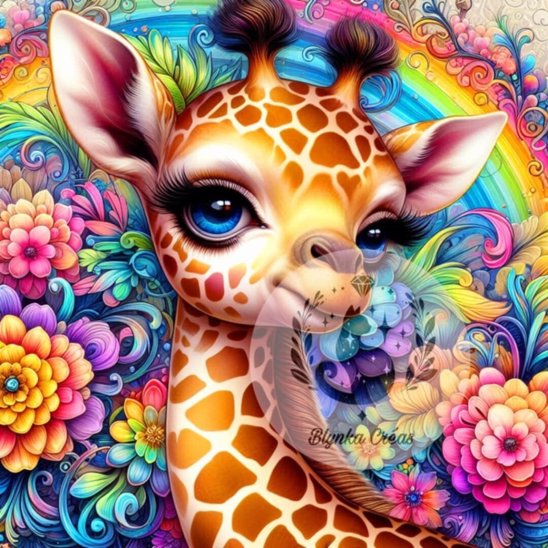 Plongez dans l'univers enchanteur de Fleur de Savane, une illustration délicate et colorée signée Lum'ia. Ce diamond painting met en lumière un girafon entouré de fleurs.