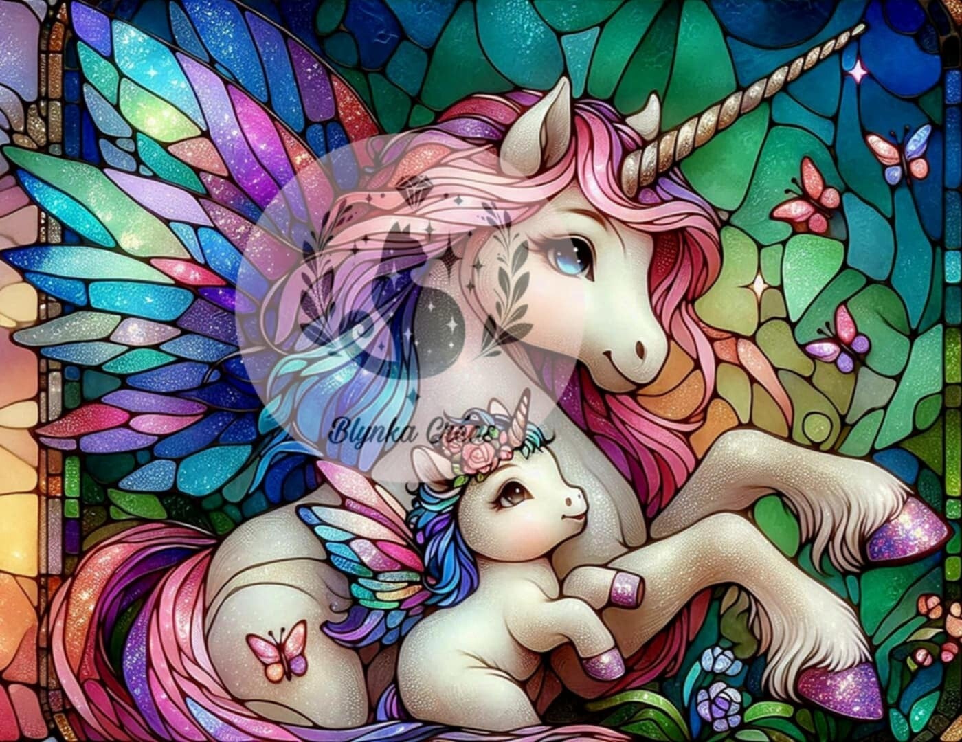 Les Licornes de l'Aube Enchantée de Lum'ia est une illustration magique où une maman licorne ailée veille tendrement sur son petit, au cœur d'un paysage féerique.