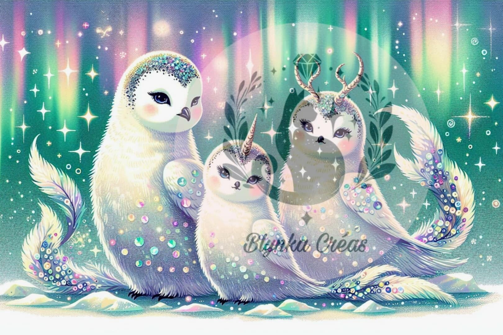 Les Gardiens de la Lueur Boréale de Lum'ia : Trois créatures magiques, veillent sous une aurore boréale, illuminant les cieux d'une lueur surnaturelle.