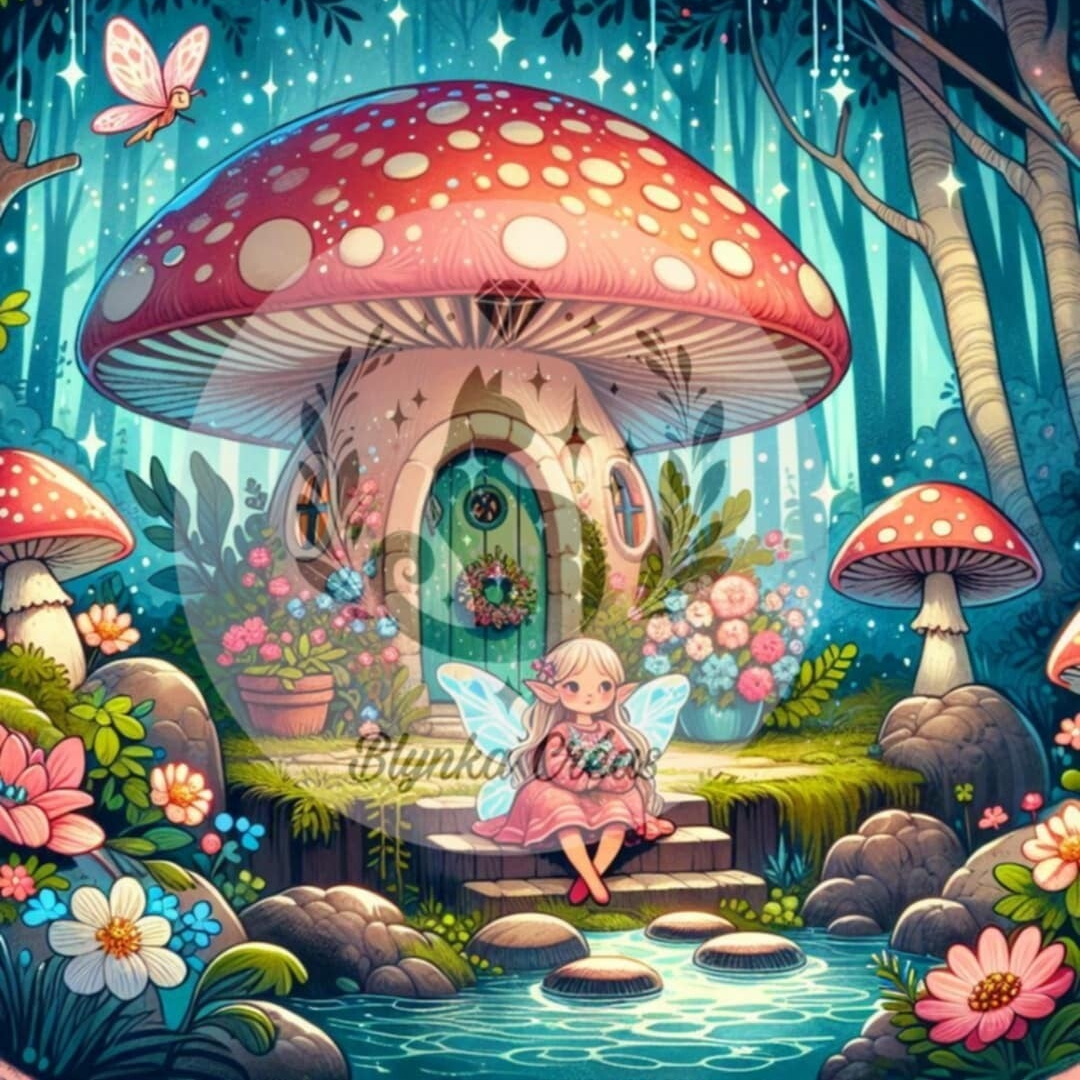 Le Logis Enchanté de la Fée de Lum'ia : Une petite fée installée devant sa maison champignon.