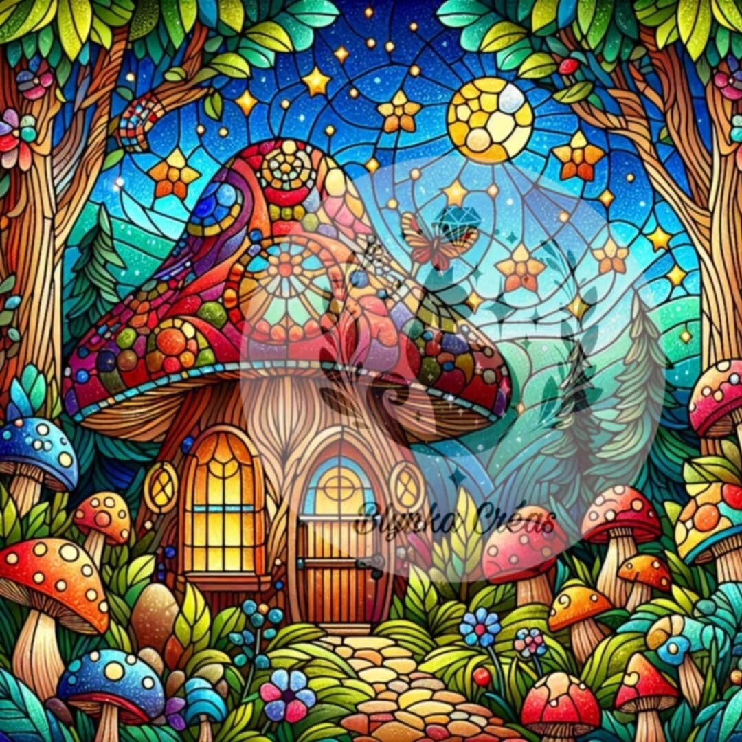 L'Éclat du Champignon Vitraillé de Lum'ia : Une maison champignon enchantée, baignée de lumière et sublimée par un effet vitrail magique, où chaque détail scintille d'une douce harmonie.