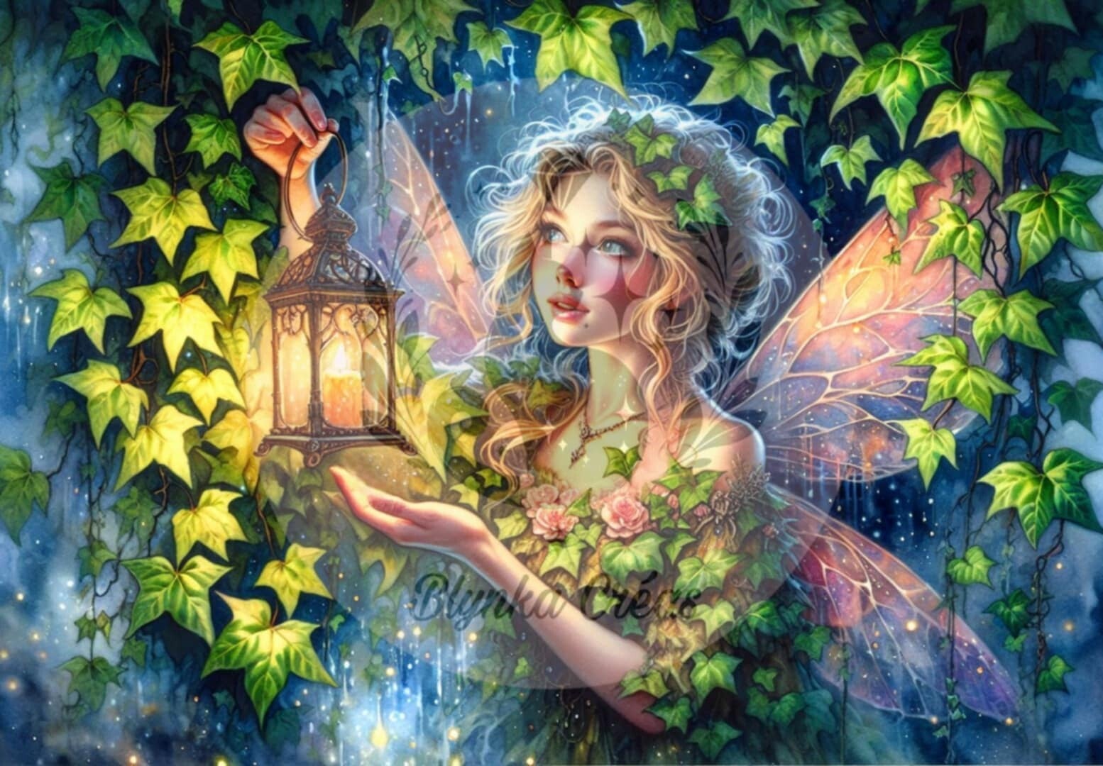 Dans une forêt magique enveloppée de lierre, une fée lumineuse veille, lanterne à la main, guidant les âmes perdues entre rêve et nature