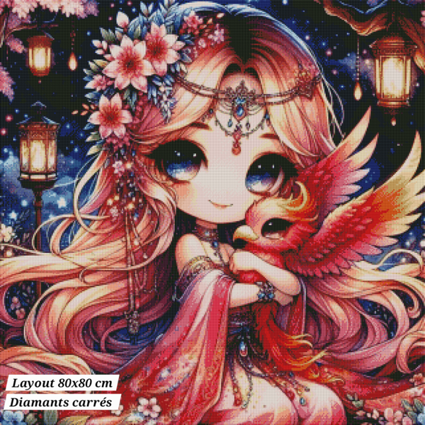 Une adorable chibi rayonne aux côtés d’un majestueux phénix, dans un éclat de magie et de flammes éternelles.